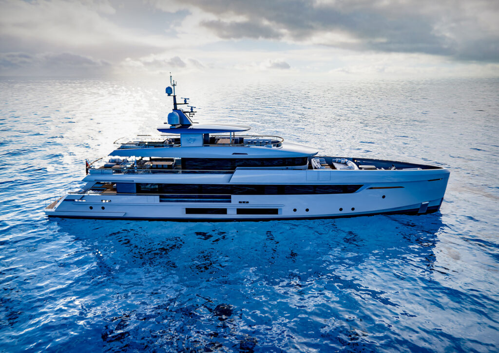 Built in steel and aluminum, the exterior design of the T450 by Giorgio M. Cassetta is in line with the brand’s timeless styling but adds a bold vertical element to the superstructure and very well balanced horizontal lines.
