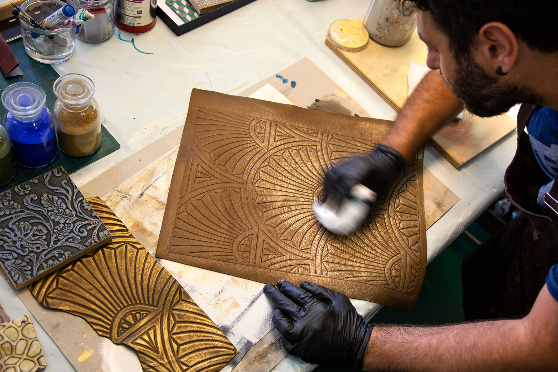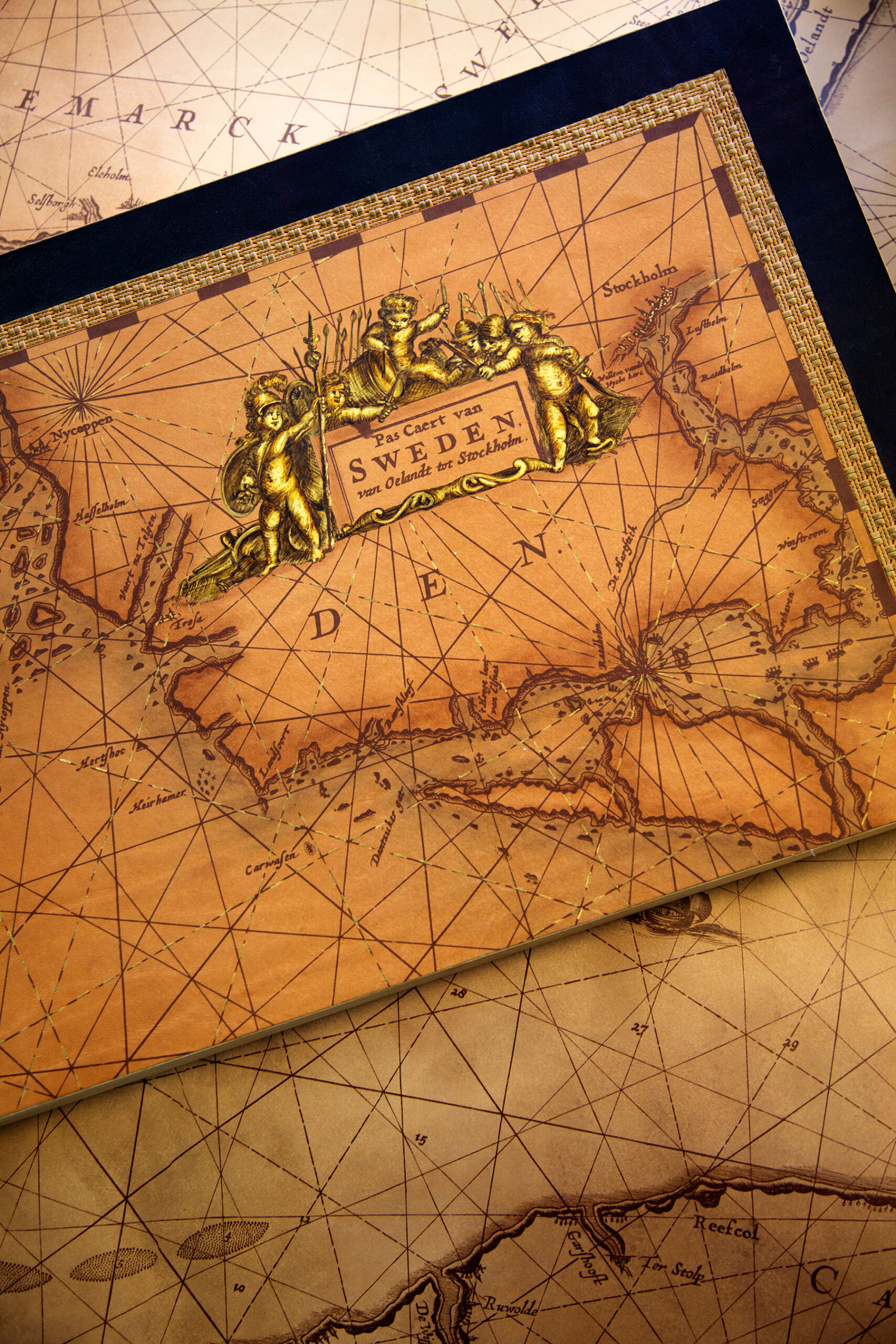 “We first scanned the original map and cleaned up the image to remove the blemishes and creases copied from the paper,” he says. “Then we transferred the image onto the leather and added the gold highlights and shading effects by hand to give it an antiqued look. The whole process took several days.”