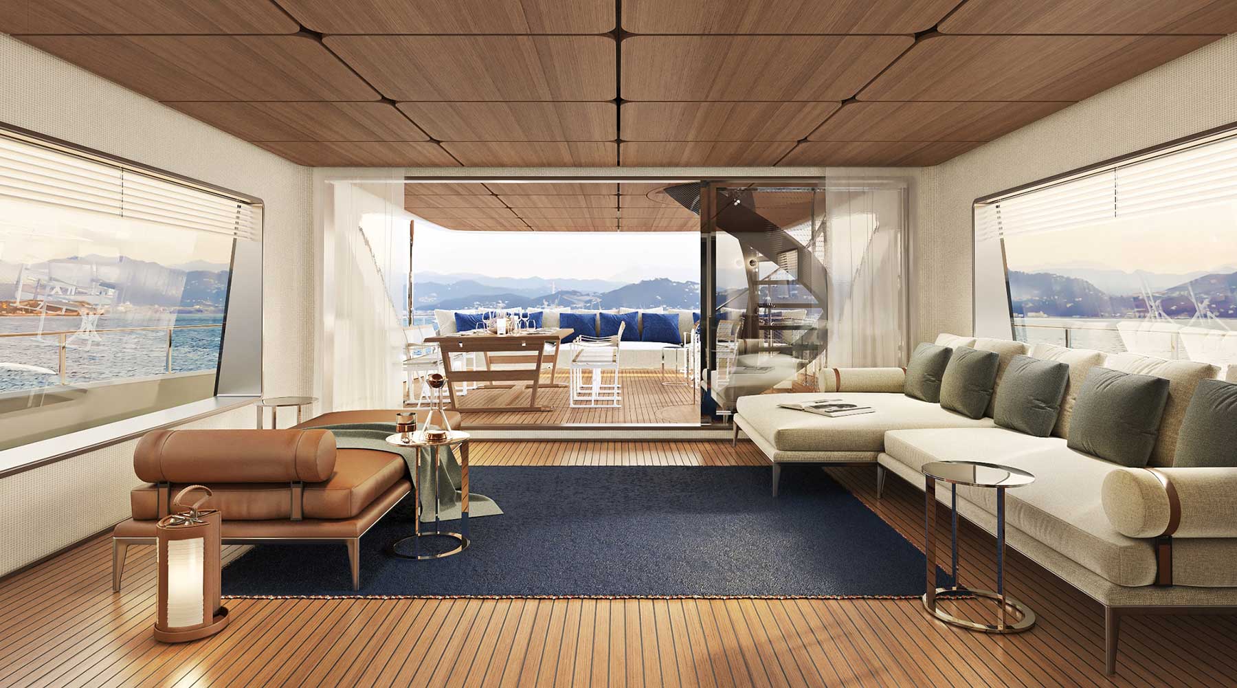 The exterior design features large glazed windows in the hull and superstructure, with deck heights of more than 6 ½ feet (2 meters) and very spacious areas forward and aft. With finishes and furniture that match the inside, the outdoor spaces can be used not only for dining and relaxation. Great prominence has been given to the connections between inside and outside areas. The former has been opened up to the exterior as much as possible to offer broader, more panoramic views reaching out over the sea to the horizon.