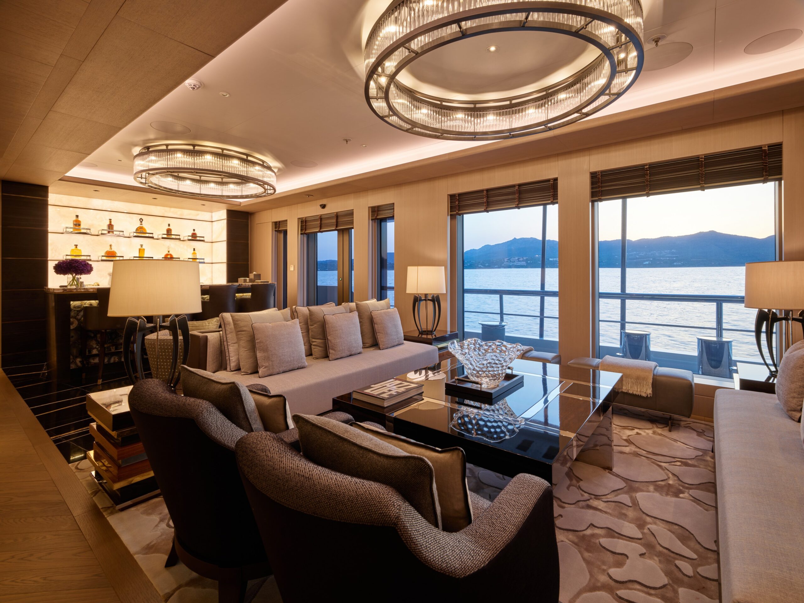 Other client-driven essentials include high ceilings; a substantial gym on the spa deck with a steam room, sauna, and hot and cold plunge pools; a 32-foot (9.7-meter) swimming pool on the main deck; an outdoor pizza oven; a touch-and-go helipad; geo-locating wristwear for requesting crew service; a business center; and a private owners’ deck. The owners were just as specific when it came to the choice of interior materials and finishes.