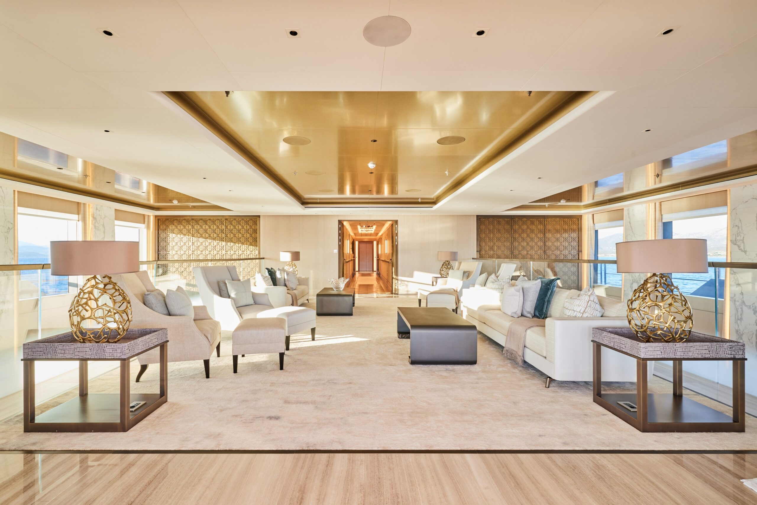 A prime example of this approach is the double-height main salon. The central balcony on the upper level has exterior views on three sides and looks down onto a gathering space on one side, a dining table on the other, and a walkway in the middle flanked by rotating screens of metallic bronze mesh. A home video that Rowell took on his smartphone from the upper level while underway is the most reposted item on the studio’s social media channels.