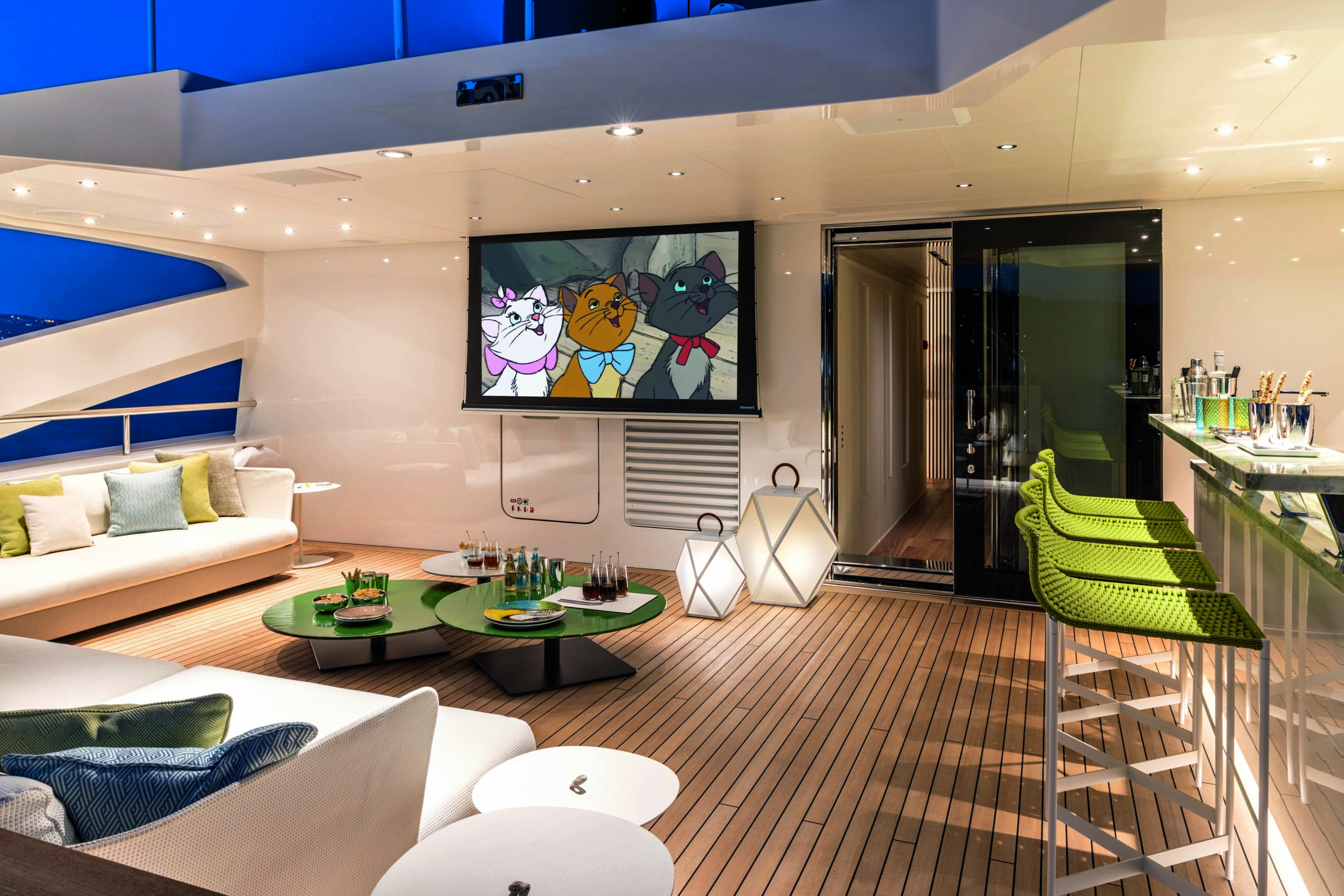 This highly versatile area becomes a fully equipped open-air private cinema with a big screen and projector that slide down from the ceiling; it can also host lively karaoke evenings with friends. The outdoor lounge with comfy sofas includes an American bar with waterside seats; the beautiful Irish Green marble top forms a chromatic continuum with the one on the owner deck below.