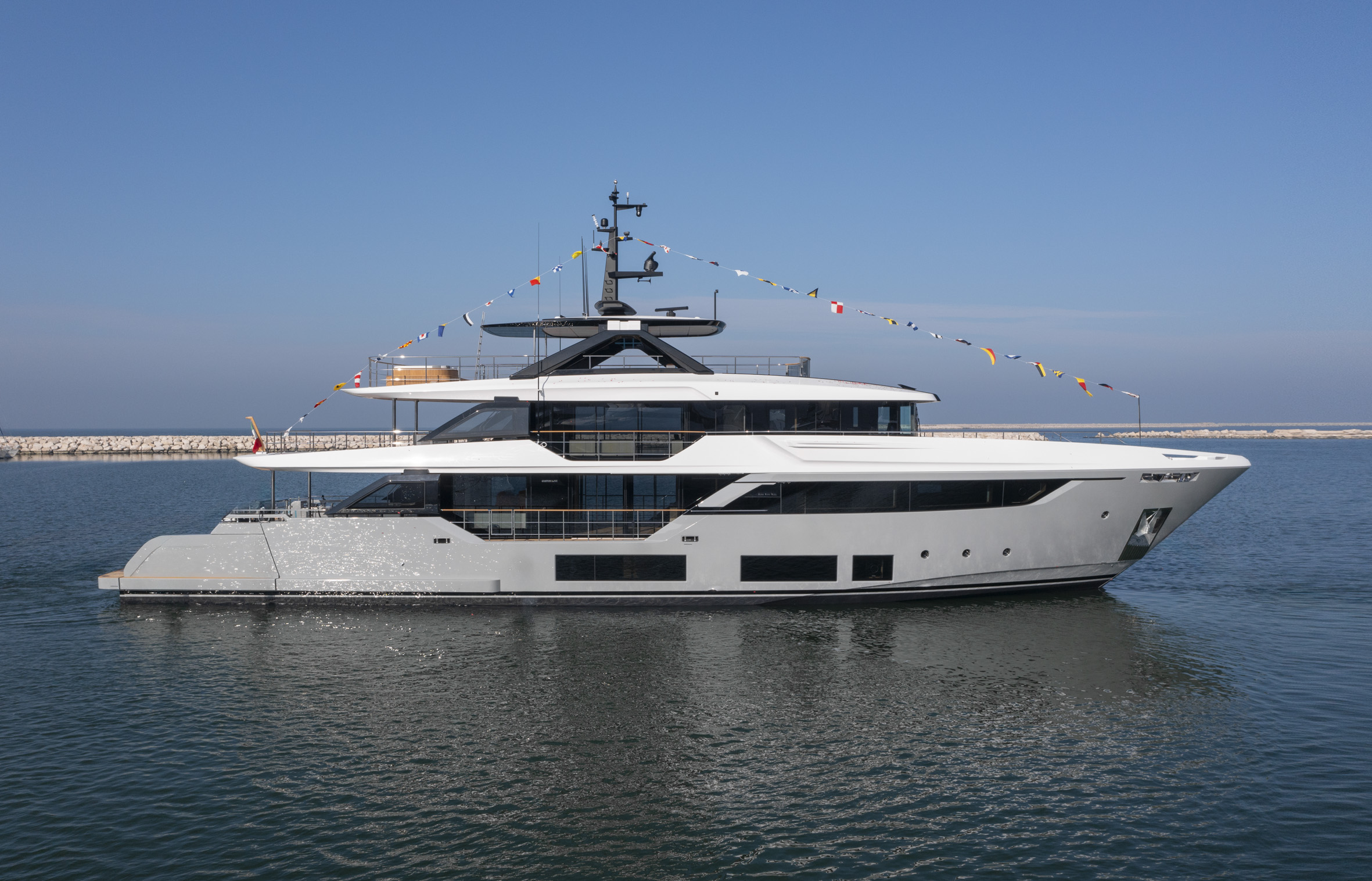The first Custom Line Navetta 38 superyacht touched the water for the first time at the end of January, at the Ferretti Group Superyacht Yard