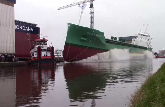 On Friday, the Westerbroek, Netherlands yard of Ferus Smit sideways launched 390-foot (119-meter) cargo ship Arklow Breeze, the sixth and last vessel in a series that will be delivered to the client from the city of Arklow, Ireland.