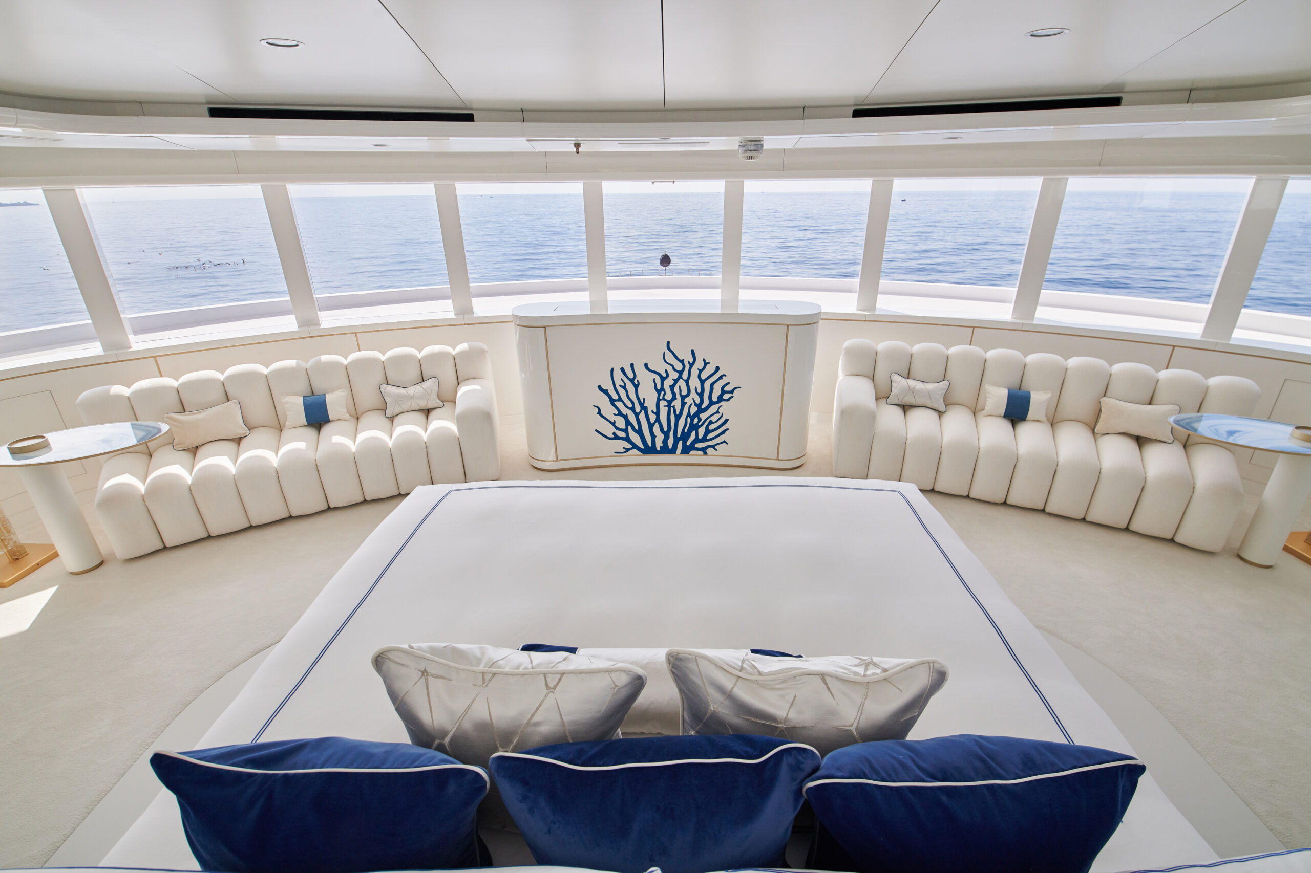 Today, Coral Ocean is the flagship vessel in the Ahoy Club, a digital charter platform that Malouf founded in 2018. H2 Yacht Design in London oversaw changes to the exterior decks and layouts, while Malouf’s wife, Larissa, an interior designer, handled the renovations inside. She transformed the yacht from a dark ambience to a bright, light décor that incorporates many shades of her favorite color, blue.