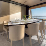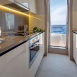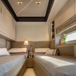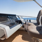 Of course, Azimut is now one of the most experienced and successful boatbuilders in Europe, and has been a dominant producer of this size motoryacht for decades. The new 80 is the latest in a very long line, and pretty much everything about it speaks of the shipyard’s expertise in balancing the realities of production-line economics with customers’ expectations of a bespoke finish. So things like the hardtop and hot tub are optional extras, along with the stabilizer system—you can have CMC fins or Seakeepers—and as for the engines, there’s a choice of just two. When it comes to the layout, what you see is pretty much what you get: a four-cabin boat with a midships master suite, the VIP in the bows, another double en suite and a twin cabin with an extra fold-down Pullman berth.