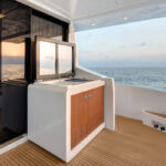 Perhaps the biggest thing about this extraordinarily comfortable 80-foot motoryacht is, well, how big it is. What you might be tempted to call the flybridge, but which Azimut with justification prefers to call the sundeck, has an area of more than 440 square feet (40.9 square meters). The hydraulic aft platform can take a 12-foot-8-inch (3.8-meter) RIB. You could play table tennis in the salon, and if the master suite was in Manhattan, you could get $2,000 a month for it. Nowhere is short of headroom—about 6 feet 6 inches is as low as it gets—and the beds are full-size with very useful volumes of stowage under all three doubles, which lift bodily on gas struts. The impression you get of wide-open spaces is not a piece of clever sleight of hand by the designers, but actual length and breadth, accentuated by some truly enormous windows, including a floor-to-ceiling expanse of glass in the salon, complemented by a cutaway bulwark to maximize the view.