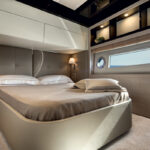 There are no fewer than four different interior decoration schemes available on the 80 from the design studio of Achille Salvagni, who also did the Azimut 84 last year. Divided into “classic” and “contemporary,” they mix and match fabrics and finishes with furniture and fixtures like lamps and taps, and have names like “Firenze” and “Dolce Vita.” Our yacht’s interior was the contemporary “Riviera” option, and while to me it looked like it would be restful and relaxing after a hard day’s play on the water, I wouldn’t personally choose the leather-topped dining table—not unless I wanted to drive my crew to distraction getting the red wine out of it. And those to whom the Riviera look might seem a little on the beige side, three alternatives are available for consideration.