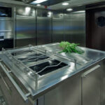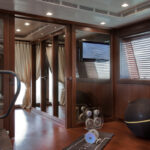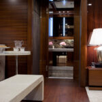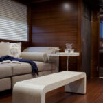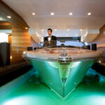 The continuity between inner spaces and the open sea finds its quintessence in one of the yacht’s most distinctive features: its floodable garage, which is home to a tender. And what a tender it is: a shiny, teak-decked Riva Iseo 27. The transverse, float-in tender dock takes up almost the entire cross section of the hull and contains around 5,000 gallons of water that, for safety reasons, can be pumped out in less than three minutes. To add drama to the relaxing atmosphere of the whole beach club/garage area, the dock is equipped with green underwater lights. Engineer Simone Lorenzano, J’Ade’s project manager, explains that to achieve the floodable garage, the yard’s engineers had to introduce important structural modifications to the naval platform normally used by CRN for its 60-meter (197-foot) yachts. Although the weight of 5,000 gallons of water is small when compared to the yacht’s 775-ton displacement, a specific study of the floodable compartment’s effect on the ship’s trim had to be made to meet the classification requirements.