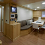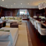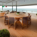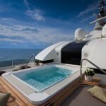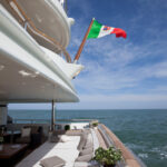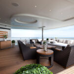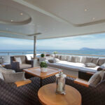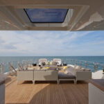 The constant relationship between indoor and outdoor areas is the element that identifies the yacht’s spirit. Inside and outside spaces flow seamlessly from one to the other. The generous openings on each deck have ensured that the interior environment is inundated with natural light and also affords excellent views of both sea and landscapes. The utmost care went into decorating outside spaces, which feature furniture comparable to that used inside.