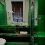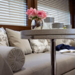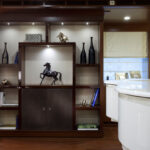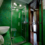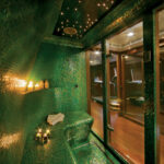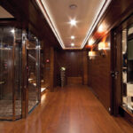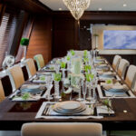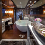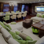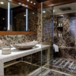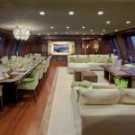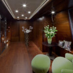 Although the predominant color combination is brown and off-white, what really makes a difference is the very clever use of the jade color in the décor and furnishings. A nonchalant glint of jade is scattered here and there. A cushion, a throw or a small armchair lend vivacity to a relaxing corner. Two of the 10 chairs surrounding the table in the formal dining room on the upper deck stand out for their brilliant jade-green upholstery. Again it is the green color that enlightens the sundeck’s wellness area. Both the hammam and the bathroom are covered with shiny green mosaic Bisazza tiles. This selective use of color ensured that what could have been an austere interior is in fact both warm and welcoming, giving J’Ade’s interior considerable character.