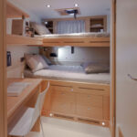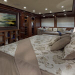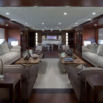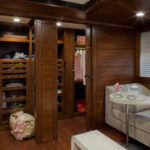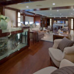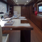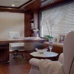 The yacht displays a traditional interior layout with ample space dedicated to social life, both inside and out. Five comfortable cabins accommodate 10 guests, including the owners. All are pampered by 13 crew. The interior decoration was envisioned by the owner’s wife, developed by Zuccon International Project, and then entrusted to the care of architect Costanza Pazzi, CRN’s interior decoration manager. The owner’s wife personally chose the elegant Loro Piana custom-printed leathers and fabrics, as well as the furniture pieces by Fendi Casa, Baxter and Poltrona Frau. The result is a refined, warm and original décor based on a two-color scheme.