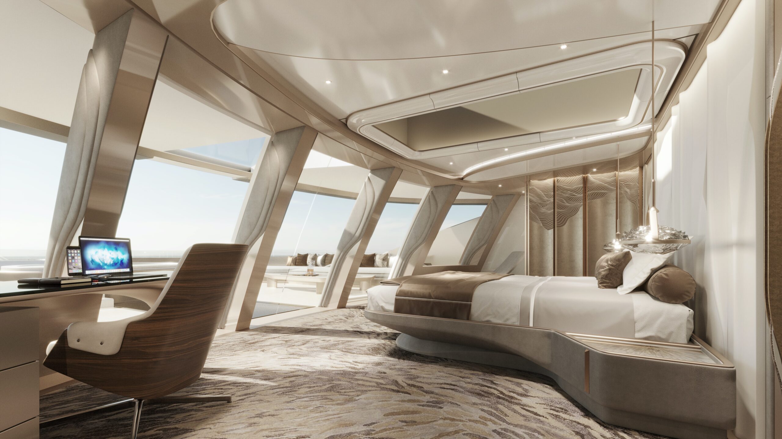 To conceptualize Slice’s interior, Feadship turned to Dutch designer Marco van Ham and asked him to avoid teak entirely. Instead, Van Ham and his team brought in a palette of backlit marbles and onyx, surfaces formed of liquid metals, silver leaf, shagreen, straw marquetry and even pyrite with juxtapositions of shiny and matte surfaces. Warm neutral fabrics evoke a spirit of calm relaxation. Undulating lines inform the floors and most of the furniture reflects organic shapes and is kept low to avoid obscuring views. What you won’t find on the concept for Slice’s interior are squared off doors and box-like rooms.