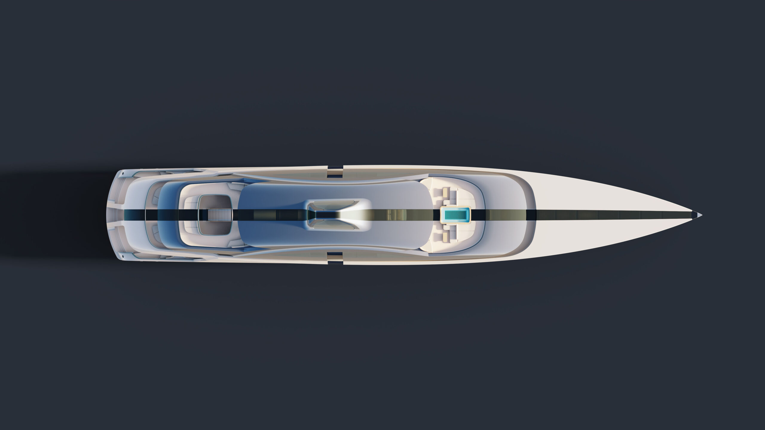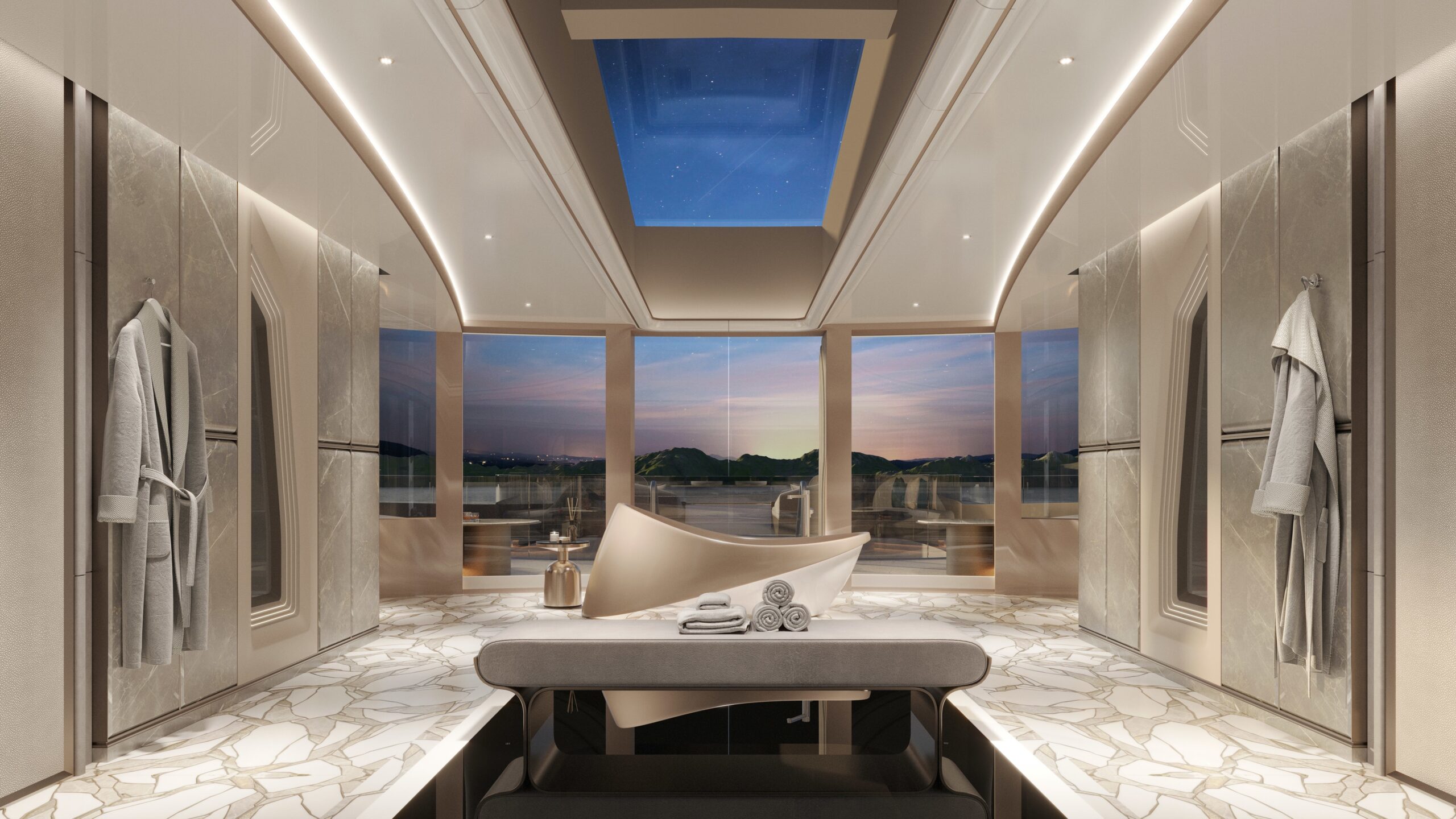 The brief to the engineer and the design team was to challenge the very zeitgeist of typical yacht layouts by investigating natural light and vertical spaces. More specifically, the brief asked for a linear “transition from the mountain to the sea.” Having a slice running down the middle opens up countless spatial and lighting possibilities. Corridors become more than just hallways transitioning from one space to another—they have their own purpose and become enjoyable spaces in their own right. The heart of the yacht is the monumental 70-square-meter atrium at main deck level. Uninterrupted by a staircase, the atrium is more than a lobby. It’s a destination in its own right for guests moving fore and aft. Its cascading circular balconies open a wide range of possibilities for lighting and art installations.