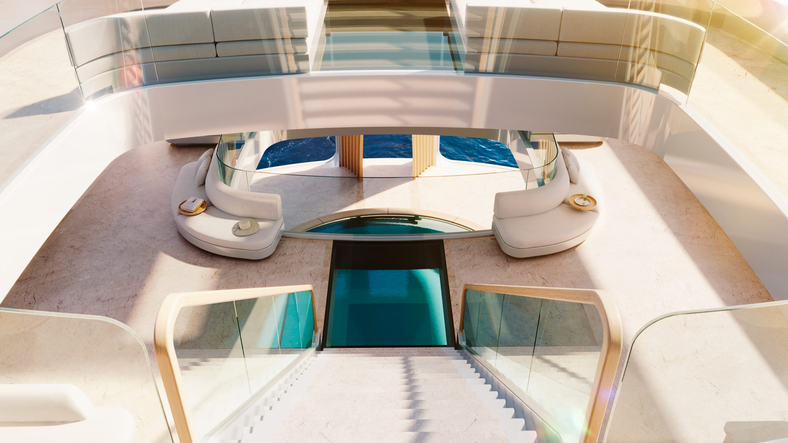Another striking feature of Slice is a 10-meter-long pool designed using data science. Often used to determine hull efficiency, comfort at sea and at anchor calculations, the design team embraced data science to define the pool’s shape and placement of hidden dampers to conquer slosh. Similarly impressive is the use of ultra-high-modulus material inspired by Formula 1’s research into high-tensile carbon fiber. While F1’s high-tensile carbon fiber wasn’t stiff enough for yachting needs, the De Voogt team worked with carbon fiber manufacturers to develop their own specific ultra-high modulus material. “The strips we bonded to the main girders of a wheelhouse deck are two times higher stiffness than steel but are lower in weight than aluminum.” The material is already being used in Feadship’s yards, giving the design team the confidence to integrate it into the atrium, multi-level walkways and the framework for the long glass insets on Slice’s top deck.