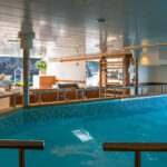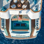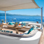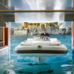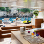 Latona‘s lower deck aft area has a large, open-air living area integrated with the beach club featuring the Turkish bath, fitness area, solarium, and arsenal of water toys. The sea-water indoor pool becomes a garage for the tender when the yacht is cruising.