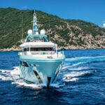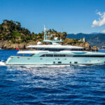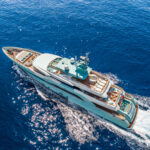 The owner was an active participant in the design and customization, in pursuit of a uniqueness, which is even reflected down to the hull color—a stylish shade of turquoise whose intensity varies depending on the sea floor and the waters in which the yacht is cruising.