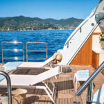 The sundeck, in typical Mediterranean style, is made up of three separate areas that unite to become one single open space: the dining area, the forward sunbathing area fitted with a Jacuzzi, and the aft solarium, furnished with four sun beds and a vast sunbathing area that remains isolated from the rest of the deck.