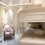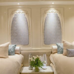 The lower deck hosts the four guest cabins, with two VIP cabins aft and two twin cabins forward. One is for younger children and is furnished with a bunk bed (plus a concealed bed for the nanny), while the second has two sliding beds that can be converted into a double, as well as an additional pullman bed. All cabins are ensuite, with bathrooms sharing the same style as the owner’s, from the fine marbles to the large showers with a seat.