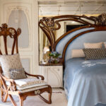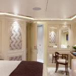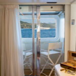 The master stateroom features handmade details, such as a bed headboard in dark walnut wood and light-blue velvet, soft and sinuous lines of the furniture, white wool and silk carpeting and elegant appliques in blown glass. The ceiling boasts wooden five-petal flowers forming a crown around the spotlights. On the starboard side of the suite, a spacious private terrace offers a magnificent view of the sea.