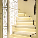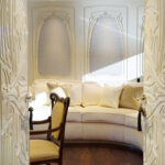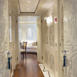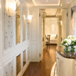 Amidships, along the corridor, a 1920s Parisian atmosphere enchants guests, thanks to the Liberty decorations on the doors and the uninterrupted wood panels decorated with floral patterns that separate the main salon from the lobby and the owner’s apartment. In particular, the spiral staircase in front of the lift, which connects the three guest decks internally, is fitted with a central backlit column in wood lined with silver leaf.