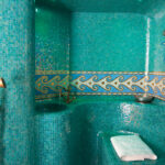 Two entrances allow access to the his-and-her bathroom, adorned in bright Carrara marble. A large circular hydromassage tub and a walkthrough shower are located in the central part of the bathroom, while the finely elegant taps and the doors in processed glass with haut- and bas-relief decorations add a unique touch to the room.