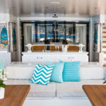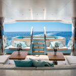 The cockpit on the main deck features large, comfortable living areas in the light blue and turquoise color shades found in all outdoor decorations, and a wide swimming pool with a mosaic that combines turquoise shades and golden details while also letting plenty of natural light shine through to illuminate the tender bay below it.
