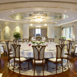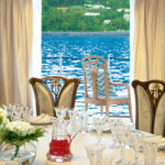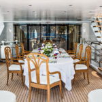 The main deck salon includes a large dining room furnished with a round table in walnut wood with silver decorations and chairs embellished by a floral pattern. The ceiling above this area has mirrors and wooden carvings that balance the Emperor Dark embroidery decorating the floor. The ceiling-high glazing allows the opening of the dining area on three sides, to dine alfresco and enjoy the breathtaking view from two terraces.