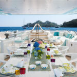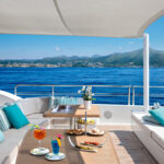 The inflatable slide, one of the family’s favorite toys, is deployed on one side towards the stern, while the central area, conceived to enjoy the pleasure of sharing meals with the family’s guests, also features a pleasant water mist system installed in the ceiling to cool this area when needed. Additional features include a barbecue and an American-style bar.