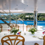The upper deck features a large salon devoted to music. Liberty style prevails here as well, with a custom-made sofa shaped as a lyre, a musical instrument typical of the 1920s, and by the decoration of the white carpet lying at its feet. Another eye-catcher in this room is an elegant, white-lacquered grand piano. Wide windows and glazed surfaces opening up to 120 degrees make the music salon very bright with breathtaking views. Outside is an alfresco dining area, featuring a custom teak table in Liberty style, a bar and an open-air tea room, a real jewel on this deck. Two large sun pads and an inflatable climbing wall complete this unique deck. The upper deck lobby is embellished by Central European-style details and covered by a skylight that lets in plenty of light directly from the sundeck.