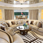 From her looks, Latona exhibits a strong personality, seemingly combining her elegant exterior lines with functional outdoor and indoor areas, as well as her distinctively designed interiors, taking cues from central European style of the 1920s, which is exhibited on throughout the yacht, starting from the floors, enriched by unique decorations chosen by the owner, such as the sinuous dark brown embroidery, a leitmotiv spanning all decks. Depending on the area, the pattern unravels along the floors (both marble and carpet) as well as on the curved handrail of the internal staircase, creating an eye-catching contrast with the light-shade wood paneling on the walls.