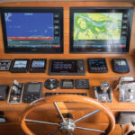 Vent boxes (with demisters) cool the 60’s machinery spaces to port and starboard, part of a system that supplants hot air with cool via natural convective air currents. The electrical system is equally forward-leaning, with four Lifeline AGM batteries divided into two starter banks, eight more Lifelines divided into two house banks, and a couple of standard, 300-watt Enerdrive solar panels on the hardtop to keep onboard refrigeration operable without shore- or genset power. Each main is equipped with a safety seacock in lieu of a conventional crash pump.