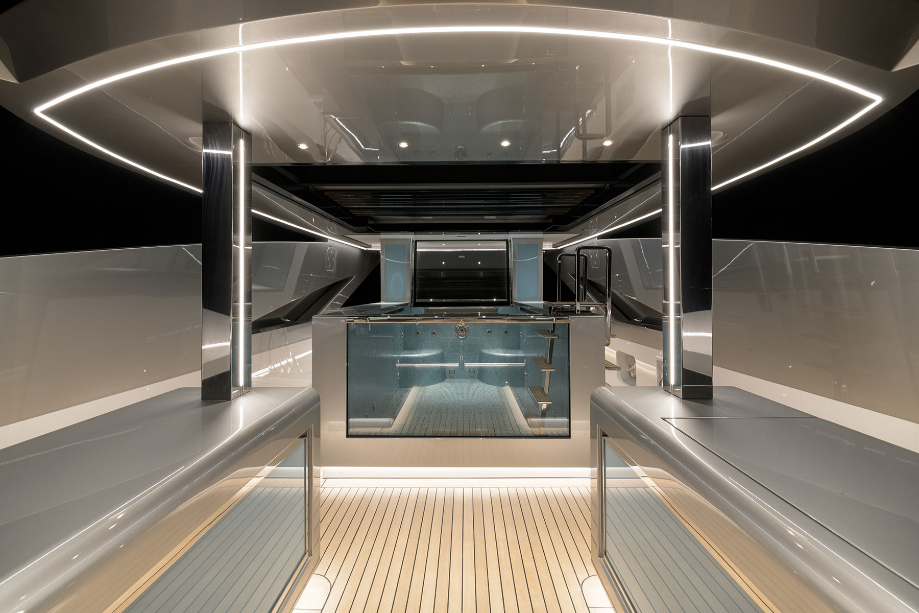The owner also wanted a steam room with aromatherapy and a plunge pool regulated to a precise 56 degrees Fahrenheit in the transom beach club; a professionally equipped galley (a Michelin-starred chef was brought in to advise); a fixed side balcony in the master stateroom; side-opening balconies in the main salon; a restaurant-quality, 300-bottle wine chiller; a bespoke LED underwater lighting package (and for the automotive-style grille in the bow); and a side-entrance lobby for displaying the owner’s art and sculpture collection.