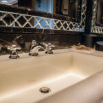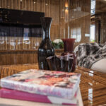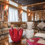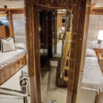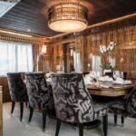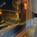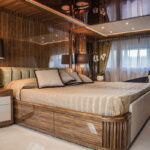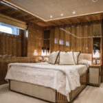 She does justice to her owner’s wishes for a highly distinctive and comfortable yacht. Her glittering and striking interior features materials fit for an emperor. Beveled mirrors, white onyx, Venetian glass and soft goods by one of the hallmarks of Italian style, the fashionable Fendi, pick up all light entering the interior. Okko’s owner chose a distinctive wood to set the tone, and a perfect high-gloss finish brings out its particular veneers. The golden and tobacco-tinged tropical hardwood’s panels were carefully matched, which had to be a painstaking task for the yard’s craftsmen. This hardwood (commonly called frakè) is known for its irregular dark streaking. Whatever they did to match these random patterns worked. The wood is a consistent theme throughout the yacht, just as the owner wished it to be.