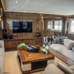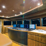 Captain Richard Gall acted as the owner’s project manager and spent time in Savona, working with the Mondo Marine team. “The shipyard was very accommodating,” he said when we met him aboard Okko in Monaco. It was particularly important since the owner was very hands-on, working closely with Vafiadis, the project management team and the shipyard. The owner not only had very specific ideas as to decorative items (as is usual), he also gave his input on the design of the helm console and even the propulsion package. One of his primary goals was to ensure onboard comfort, which dictated the choice of engines. Favoring comfort over speed, he decided to go for smaller engines than initially planned. Equipped with two MTU engines with a combined horsepower of 3,000 hp, Okko cruises at 14 knots and has a top speed of 16 knots. Her maximum range is 3,000 nautical miles at 12 knots. Floating floors and other soundproofing and noise-dampening techniques ensure the yacht is also pleasantly quiet underway. “She exceeds the requirements of RINA’s Comfort Class,” Gall said. “It is a semi-displacement hull with great seakeeping abilities.”