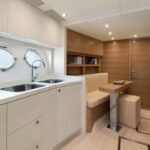 This composite modular construction, whereby the interiors are pre-assembled before being lowered into the hull and bonded in place, requires a precision not often seen in production boatbuilding. The Kevlar-laminated monocoque hull, without conventional frames and stringers, accounts for the extra interior volume for multiple layouts and the generous headroom. The added space also allows for a distinct separation between crew and guest circulation.