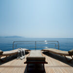 In fact, having recently written an article for Yachts International on her interior design for the 86-meter (282-foot) Lürssen Quattroelle, I was struck by some of the similarities between with the two yachts, despite the massive difference in size. Both make ample use of bronze instead of the customary stainless-steel detailing, along with Volterra alabaster and woven leather panels (the same leather used by Bottega Veneta to make its chic designer handbags). Other precious materials include cedarstone marble, mocha cream limestone and Venetian mosaics of handmade Murano glass. Fabrics and freestanding furniture are supplied by top brands Hermès, Armani and Poltrona Frau.
