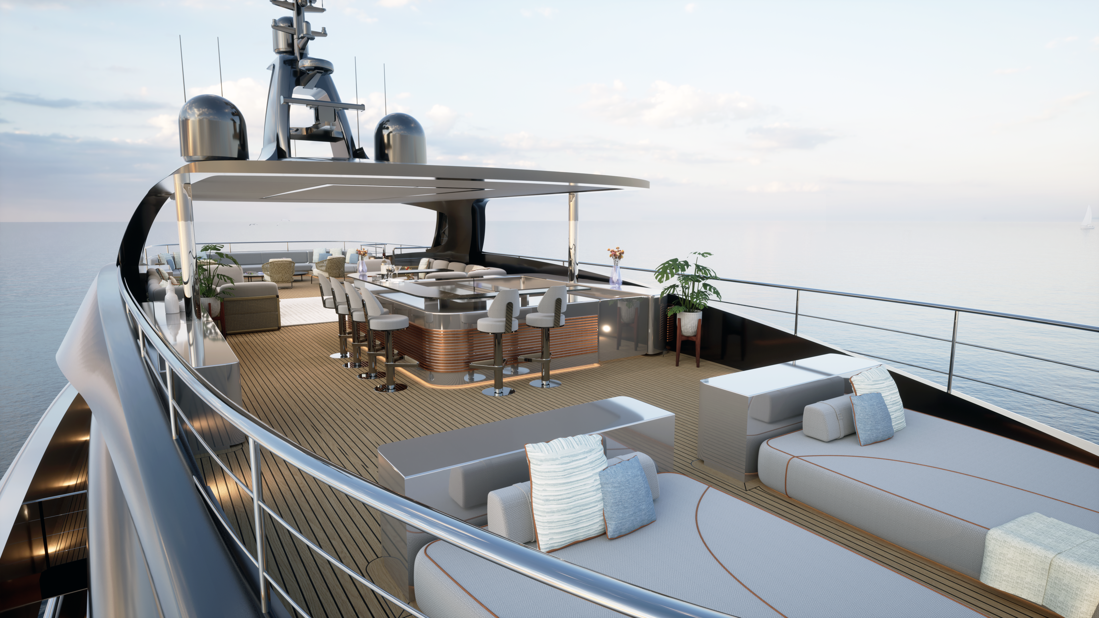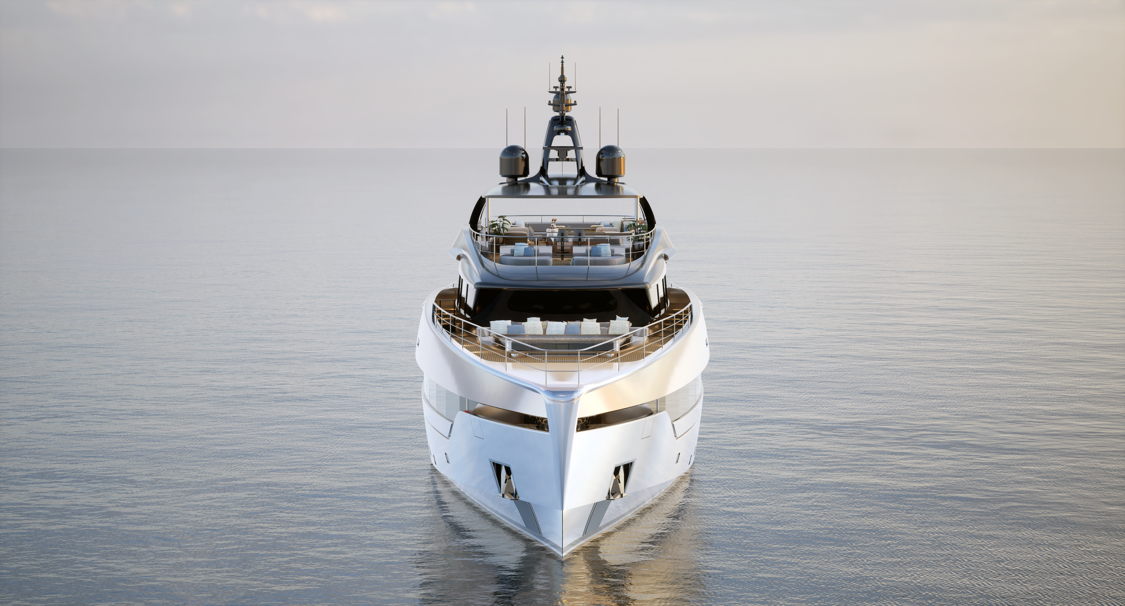 At just under 500 gross tons and with a 9.1-meter (30-foot) molded beam, she features an indoor gym, in direct connection to an outdoor beach club area; four guest cabins on the lower deck; a formal salon and dining area; and a full-beam owner’s suite with private office and his-and-hers bathrooms on the main deck. She also will have an alfresco dining area and a more intimate sky lounge on the upper deck; an outdoor lounge and pool area on the foredeck; and a 110-square-meter (1,184-square-foot) sundeck.