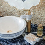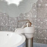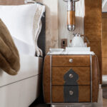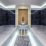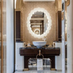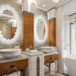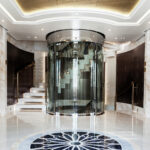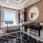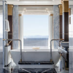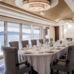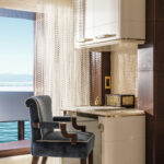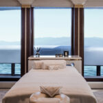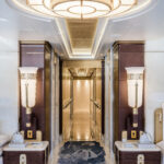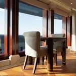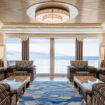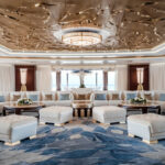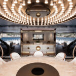 On Jubilee’s lower level are a beach club with an aquarium, wellness area, gym and hammam. On the main deck, sun lounges surround a pool. Windows in the pool add light, and a waterfall creates boundaries between the pool and dining area. Decorative columns, inspired by classic architecture, are also structural.