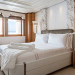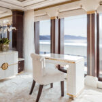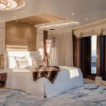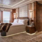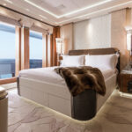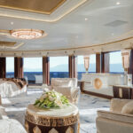 The bridge is on the upper deck, just below the owners’ decks. Also on the upper deck are four VIP staterooms with a communal lounge and dining area aft. On the main deck are 10 additional guest staterooms, as well as several salons and a club lounge. Foldout balconies to port and starboard in the main salon are near a bar.