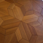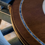 Rupert PeaceThe central dining area in the salon has a custom chandelier that hides the air-conditioning exhaust. The table’s oval shape echoes that of the chandelier and the whirlpool-like pattern on the teak sole.