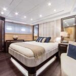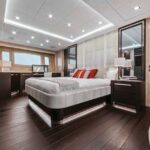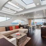 In the salon, a U-shape sofa sits opposite a substantial TV, with a freestanding dining table aft. Four LED skylights allow you to turn the sky on or off, and the side windows offer excellent views. Keeping the galley out of sight and out of mind—it’s down the aft companionway, in the crew area—ensures that the main-deck relaxation and entertaining spaces breathe easily and feel luxuriously expansive.