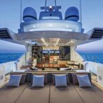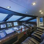 The benign conditions certainly helped, with barely a breath of breeze and just a light lop, which the 94 sliced through imperiously. Like surface drives, jets are optimized for high performance, and if the weather allows it, you might as well hammer the throttles, as moderation brings little in the way of efficiency gains. With about one-third fuel and full water tanks, plus a full inventory of cruising stores and a RIB in the stern garage, we recorded a 37-knot maximum speed. Not bad at all. Even more impressive was the 94’s handling. Her orb-like fly-by-wire controls may look weird, but they are totally intuitive and the yacht responded willingly to the lightest inputs from throttle and helm. Not even in the hardest high-speed turns did the hull threaten to lose its grip on the water, thanks to a pair of small fins at the stern not much bigger than the ones on your surfboard.