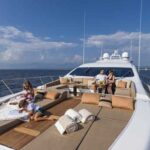 The Overmarine shipyard in Viareggio, with nearly 30 years under its belt, knows a thing or two about building yachts like this. Mangusta (it means mongoose; the boat to beat when the shipyard started was Technomarine’s Cobra) has become a byword for big, fast and luxurious boats. As for luxury, the yard has long made a reputation for itself as a purveyor of the shortest options lists in yachtbuilding. The 94’s list comprises just three items: gyro stabilizers, an upper helm station and an electrical frequency converter. Everything else is included in the price, even a custom layout. Overmarine has a remarkably relaxed attitude regarding these things, and while the standard published plans illustrate a fairly conventional four-cabin arrangement below, the first 94 had just two cabins. This particular yacht, the second off the line, had three. The port guest twin was sacrificed for a fantastic private lounge on the lower deck with a desk and sofa, and a large TV on the forward bulkhead. It’s an idyllic place to sit and read, or to quietly socialize while the bustle of real life continues upstairs.