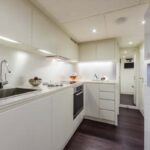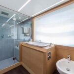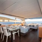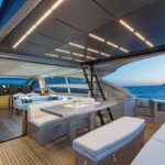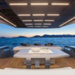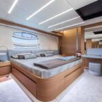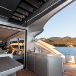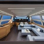 With the galley down in the crew area and low-level furnishings throughout the main deck, the salon is surrounded on all sides by glass. When the sunroof opens up and the cockpit doors slide down and away, the entire main deck becomes one huge living room, with an extending glass-and-steel dining table forward, a silver-lacquered cockpit table aft, and between them an enormous and luxuriously upholstered leather sofa.