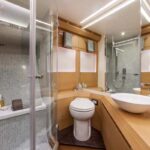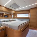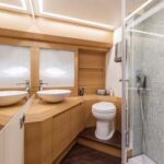 Down below, a four-cabin, three-head layout is standard, but you can have just three cabins if you prefer, with a cozy TV lounge on the starboard side. In either case, the master suite is amidships, spacious and beautifully designed.