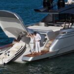 A replacement for the Pershing 80, the new 82 offers various improvements over its predecessor, including an excellent sundeck where an optional upper helm station folds away when not in use. You access the deck from a smart set of carbon fiber steps that drop down out of the deckhead.