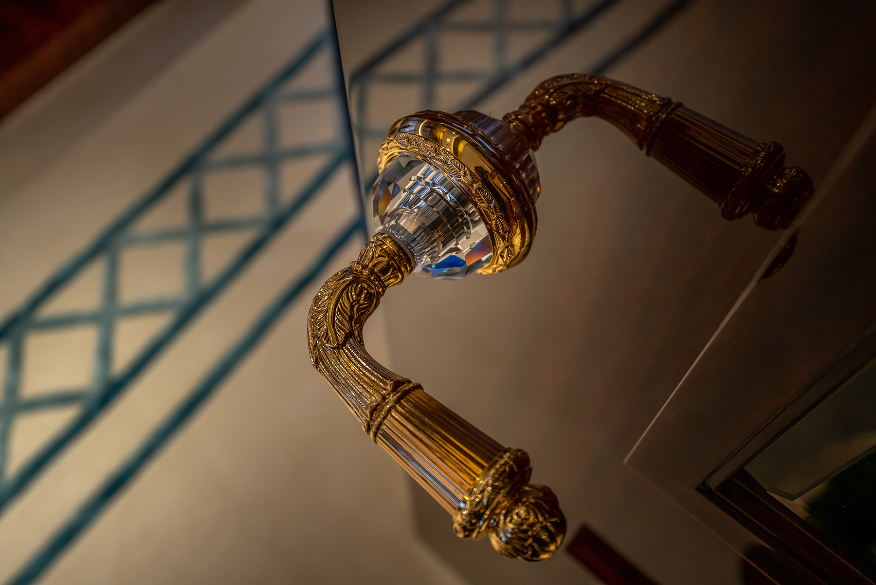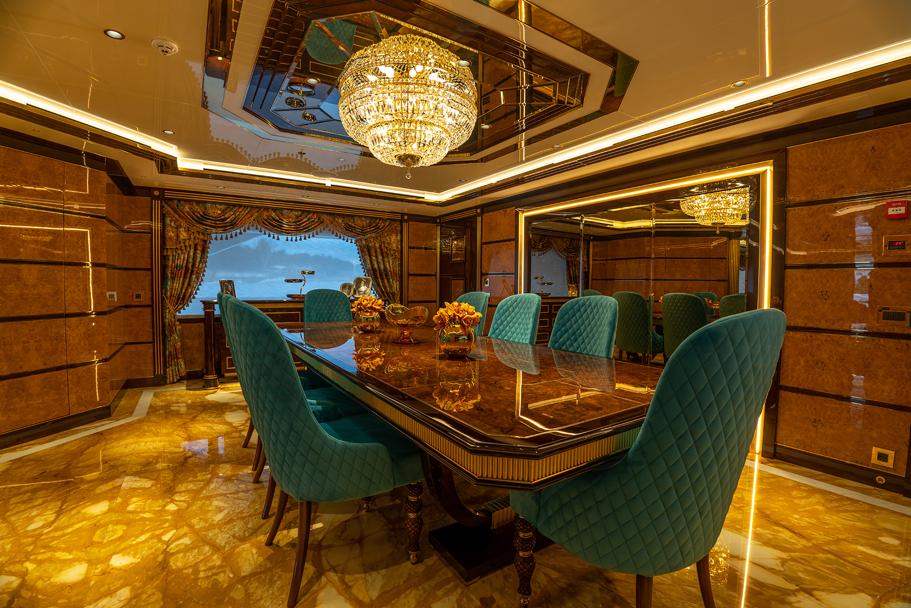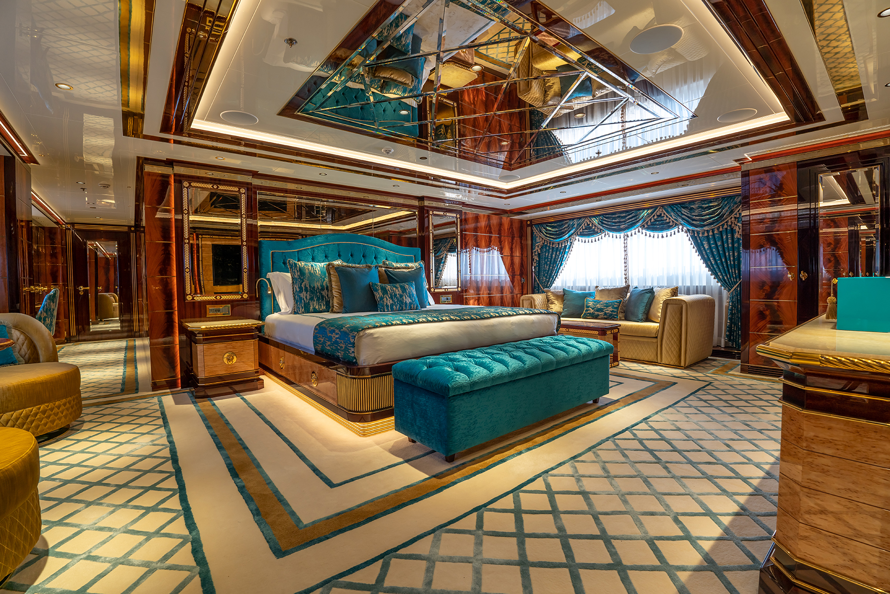Francisco MartinezAmong the rich colors and materials, 16 shades of gold are incorporated into the fabric of the interior décor. “The interior design brief of Jewels favored a traditional yacht aesthetic combining classic mahogany and walnut joinery with gold inlays, bevel-edged mirrors, colorful textiles and highly decorative stones,” says James Bermudez, designer with H2 Yacht Design.