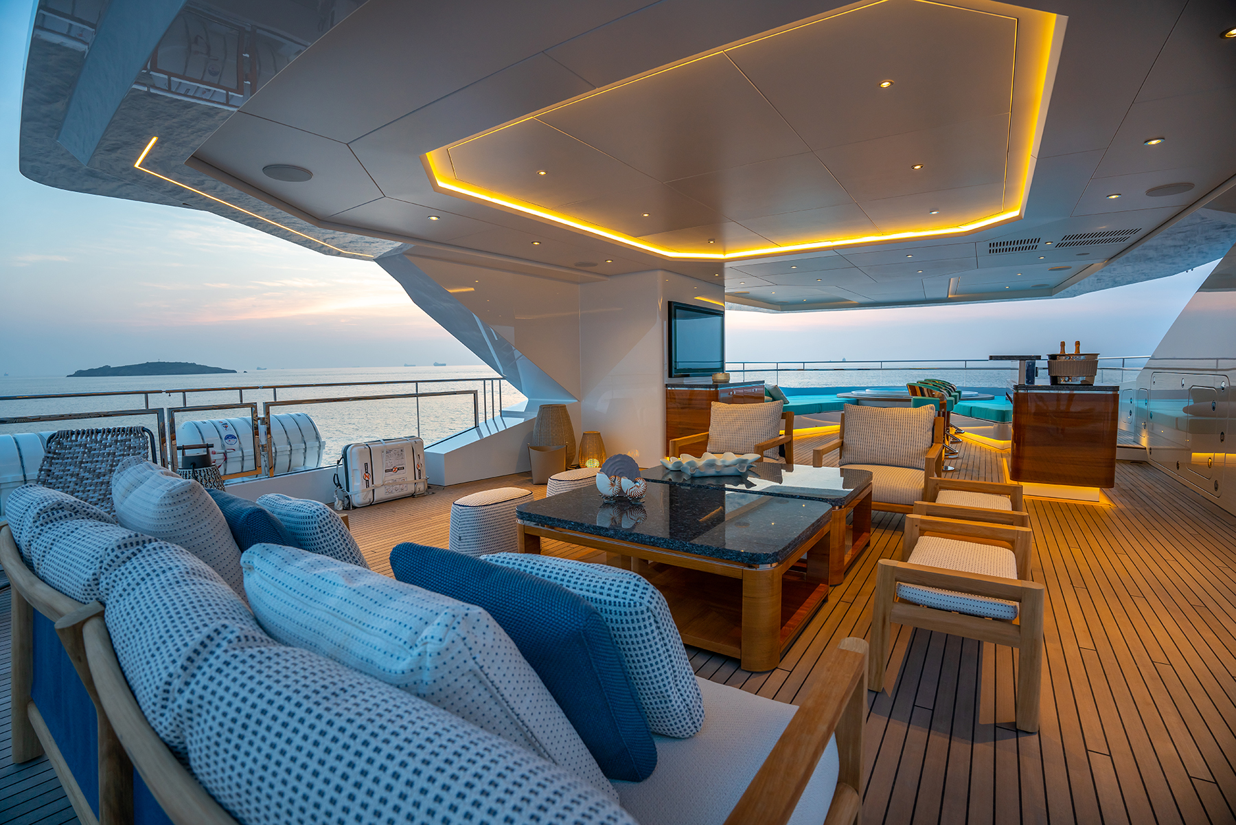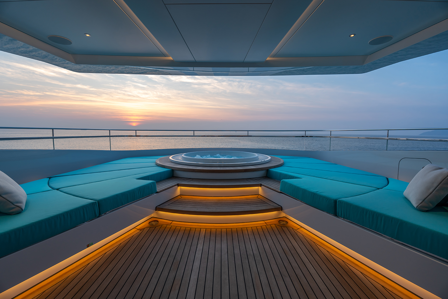 Eray AltayThe tiered effect in profile, and the geometric shapes, make the yacht look as if it’s propelling ahead. At night, linear lights further define the sharp, clean, modern profile.