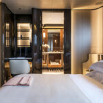 Elsewhere, he borrowed details from aeronautical design with exposed “rivets” and bronzed door handles shaped like airplane wings. Paper-silk wallpaper is in the guest staterooms, main foyer and cabinet bases, and bathrooms are lined with gray-veined Carrara marble.
